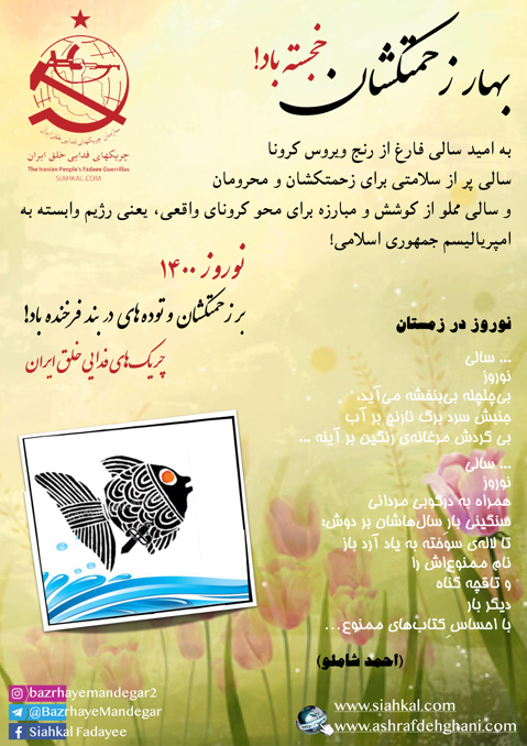 بهار زحمتکشان خجسته باد! IPFG-Bahar-Zahmatkeshan-Norooz-1400 About Post Author ashrafdehghani_admin See author's posts Continue Reading Previous اعلامیه اینستاگرام بذرهای ماندگارNext شکل گیری چریکهای فدایی خلق، و نقدِ تاریخ جعلی از همین دسته ادبیات اطلاعیه انتشارات چفخا کتاب خاطرات مادر انقلابی رفیق فاطمه سعیدی (مادر شایگان) منتشر شد! اطلاعیه سخنرانی مقاله سیاهکل و جنبش مسلحانه – گفتوگویی با رفیق اشرف دهقانی در کلابهاوس اطلاعیه انتشارات چفخا مقاله درباره کتاب جدید رفیق اشرف دهقانی با نام «بررسی زمینه ضربات سالهای ۱۳۵۴ و ۱۳۵۵ و ناگفتههایی از تاریخ چریکهای فدایی خلق ایران»