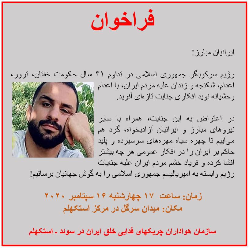 رژیم سرکوبگر جمهوری اسلامی در تداوم ۴۱ سال حکومت خفقان، ترور، اعدام، شکنجه و زندان علیه مردم ایران، با اعدام وحشیانه نوید افکاری جنایت تازهای آفرید. در اعتراض به این جنایت، همراه با سایر نیروهای مبارز و ایرانیان آزادیخواه، گرد هم میآییم تا چهره سیاه مهرههای سرسپرده و پلید حاکم بر ایران را در افکار عمومی هر چه بیشتر افشا کرده و فریاد خشم مردم ایران علیه جنایات رژیم وابسته به امپریالیسم جمهوری اسلامی را به گوش جهانیان برسانیم!